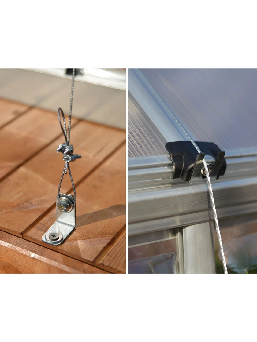 This Anchoring Kit adds extra protection against strong wind gusts, up to 62 mph. It is cleverly designed to fit your existing Palram –Canopia Greenhouse such as the Harmony, Nature, Mythos, Hybrid, Balance or Octave, and can be secured to the foundation of your choosing. This rugged and easy-to-use system gives you a series of steel cables with the necessary anchors and fasteners to keep your greenhouse snug and safe, right where you need it. If you live in an area with high winds or generally unstable weather, this simple system is a must-have. The cables simply go over the greenhouse, secured to the structure with a series of clamps, then secured to the ground with large stakes.