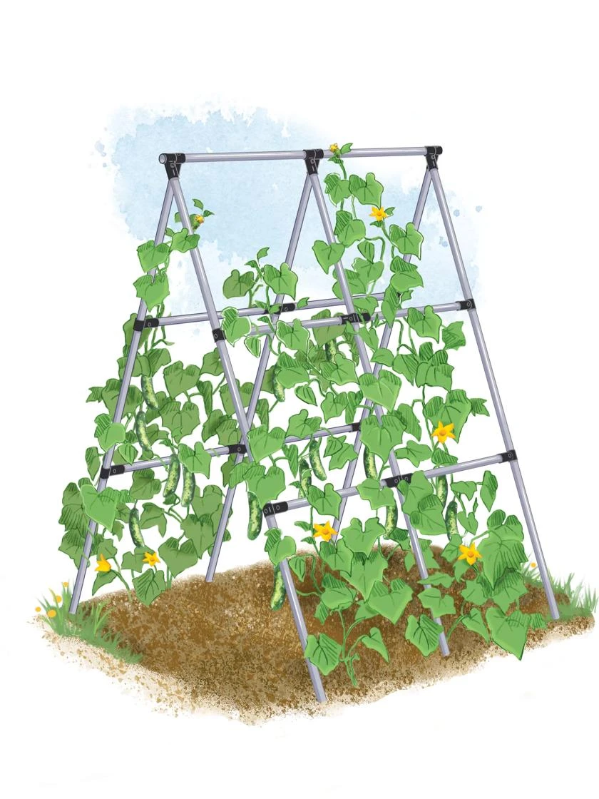 Follow our design plans with suggested pipe lengths for this A-Frame, or create your own unique structures. Build it tall enough so plants grow unhindered and you can tend underneath with ease. Add netting or twine for squash, cucumbers, peas and more. Note: Kit includes connectors only, conduit pipe not included.